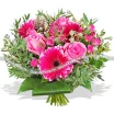 Уменьшенный: малиновая гербера - 2шт., роза розовая - 3шт., роза розовая кустовая - 1шт., декоративная зелень, сетка.