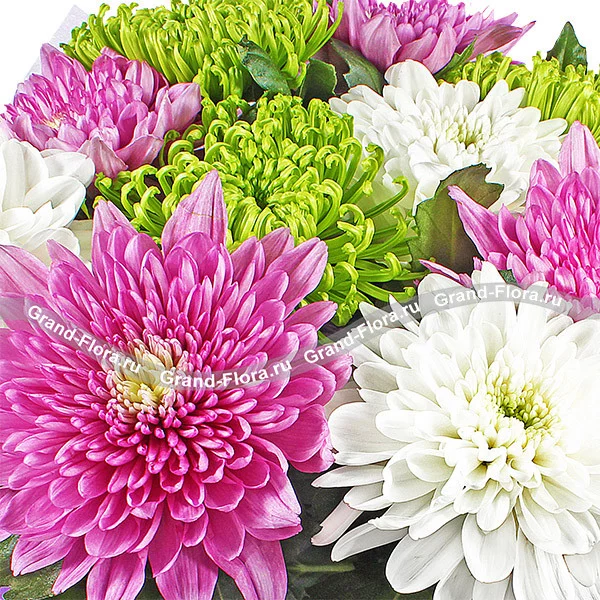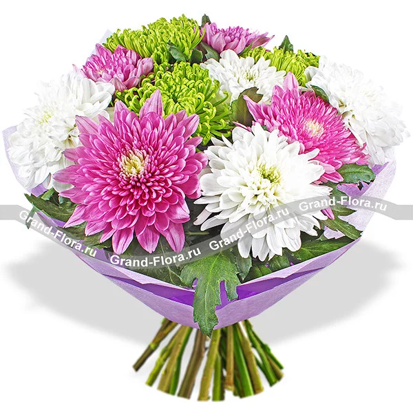 11 хризантем: хризантема белая одноголовая - 4шт., хризантема фиолетовая одноголовая - 4шт., хризантема зеленая одноголовая - 3шт., фетр фиолетовый.