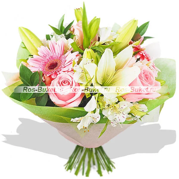 ЛЮКС: гербера розовая -  6 шт, лилия белая - 3 шт, роза розовая - 11 шт, альстромерия белая - 6 шт, рускус, фетр зеленый.