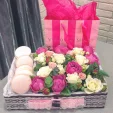 Стандартный: роза кустовая розовая - 5 шт., роза кустовая белая - 2 шт., макаруны (возможна замена на зефир), декор, оазис, коробка средняя.