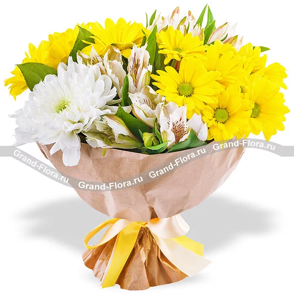 Стандартный: хризантема белая - 3 шт., альстромерия белая - 5 шт., хризантема кустовая желтая ромашковидная -5 шт., декоративная зелень, упаковка крафт, лента двойная бело-желтая. Примерный размер: 30Х30 см.