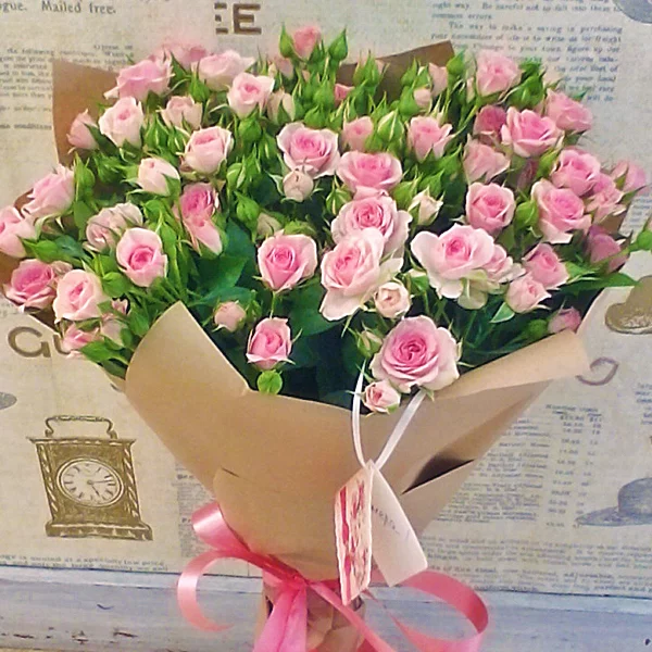 (на фото) роза кустовая розовая - 15 шт, упаковка, лента розовая. Примерный размер: 35Х35 см.
