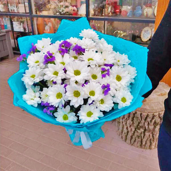 Искал букет с ромашками, нигде не мог найти. Когда позвонил в службу, мне пояснили, что в это время года ромашка не поступает в магазины, но кустовые хризантемы ничем не отличаются от ромашки. Выбрал этот букет в люксовом варианте, смотрится очень достойно. Рекомендую.