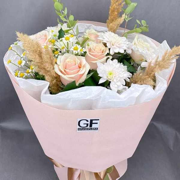 Стандартный (на фото): роза кремовая/персиковая(персиково-розовая) - 5 шт., хризантема белая - 4 шт., декоративная зелень, упаковка, лента.